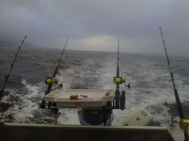 The weather still wasn’t that much chop with a light drizzle, 10-15knts of SE and a 2-3m swell. About ½ way down to Fortescue “the man” noticed fish break the surface out around the 70m mark but after a bit of circling and nothing on the sounder it was off again. We caught up with “little pig” down around The Lanterns and still neither of us had had a strike.